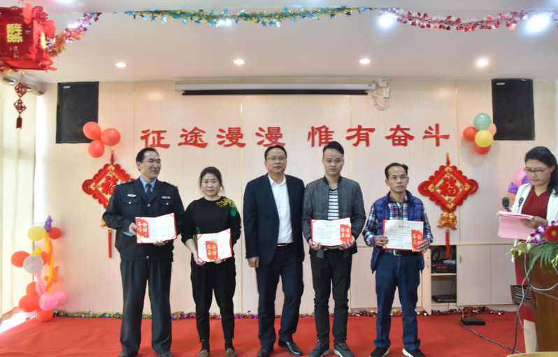營銷部經理伍綱強為邱高明、周美芳、黃榮先、龔超頒發先進個人獎