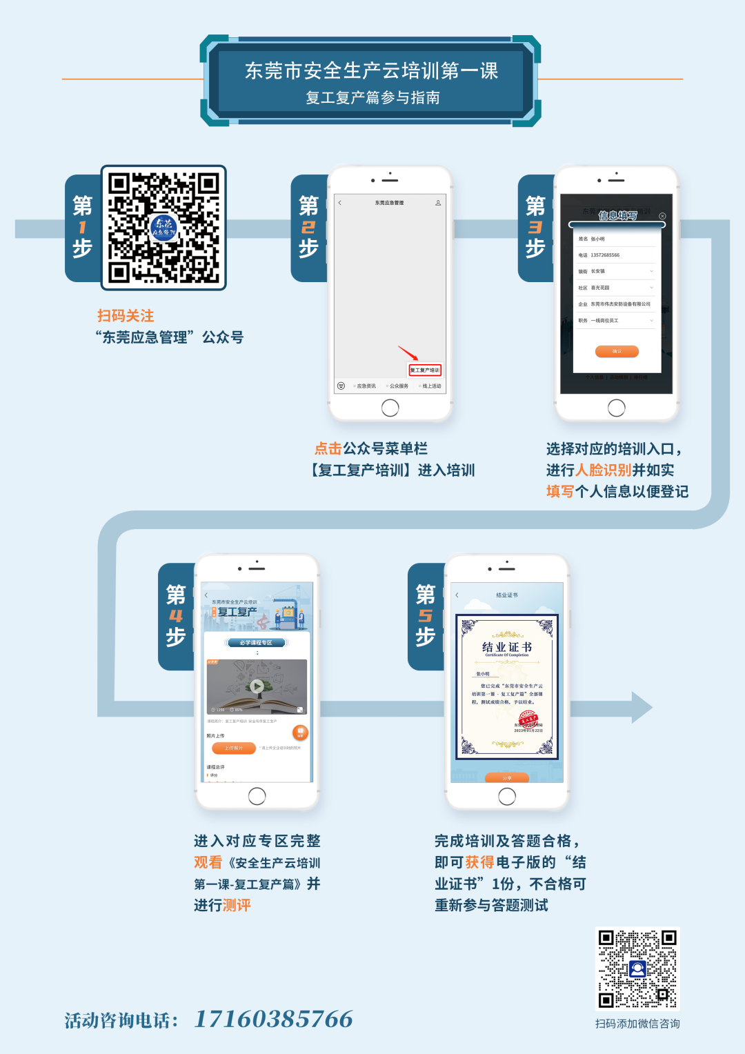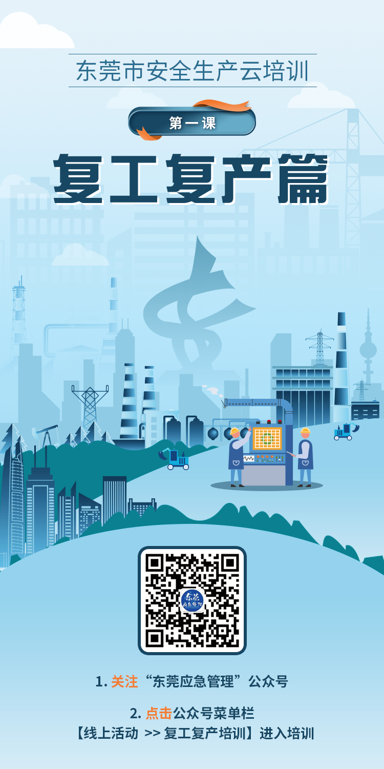 參與指南:關(guān)注“東莞應急管理”公眾號,通過點擊公眾號菜單欄【線上活動→復工復產(chǎn)培訓】,登記個人信息,完成注冊后,點擊“我要參加”進入培訓內(nèi)容界面,點擊觀看視頻進行學習。