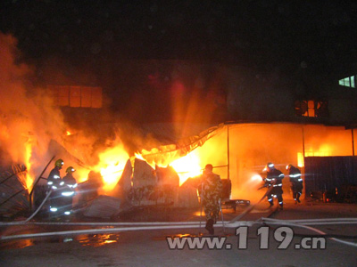 12月9日凌晨0點04分,杭州蕭山消防中隊接到區指揮中心出警單稱:新塘婁下陳凱麗紡織廠車間廠房發生火災,且火勢較大。以加強第一出動的原則,蕭山消防中隊出動4輛消防車和21名官兵趕赴現場,同時調派市北中隊及周邊民辦專職消防隊趕赴現場增援。