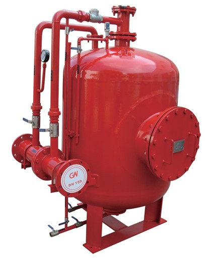 當壓力水流經比例混合器時一部分壓力水(3%-6%)由支管進入泡沫液儲罐內擠壓膠囊,置換出等量的泡沫液與另一部分水(97%-94%)在比例混合器內混合成泡沫混合液提供給泡沫產生裝置,產生空氣泡沫進行滅火。